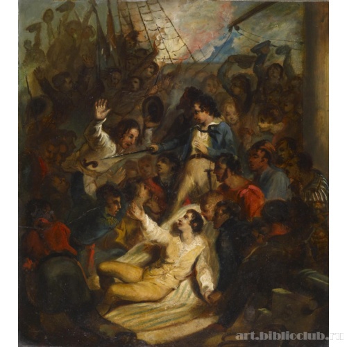 Капитан Джеймс Лоуренс (1781-1813) был смертельно ранен 6 мая 1813 года во время сражения в войне 1812 года между его кораблем ВМС США "Чесапик" и британским фрегатом HMS "Шеннон". Говорят, что, когда Лоуренса несли под палубу, он произнес свою последнюю команду - "Не сда...